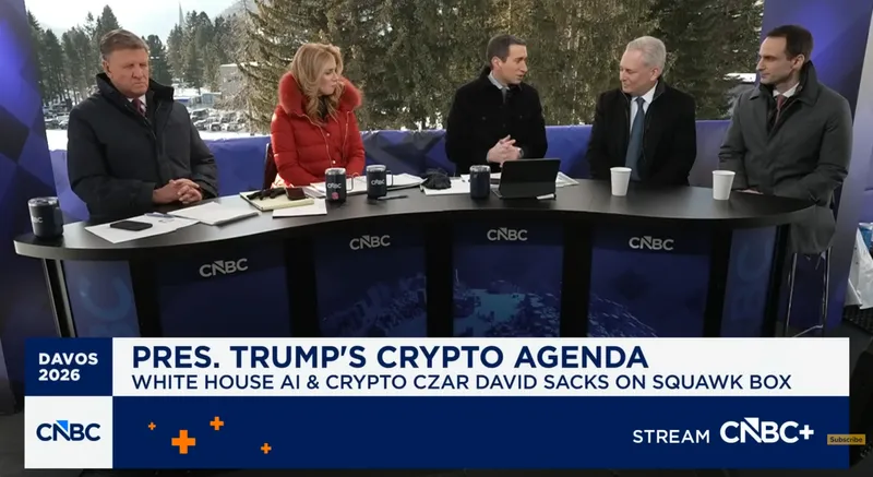 Sacks指出,一旦国会通过长期搁置的市场结构法案,银行和加密货币公司将最终融合。他在瑞士达沃斯世界经济论坛期间接受CNBC《Squawk Box》采访时提到,关于CLARITY法案的谈判因稳定币发行方是否可以提供收益而停滞不前。