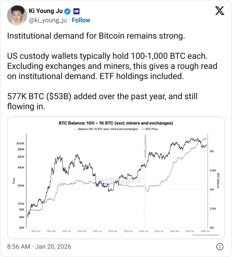 周三,CryptoQuant的Ki Young Ju指出,机构基金在过去一年中累计吸纳了577000枚比特币(BTC),约合530亿美元。