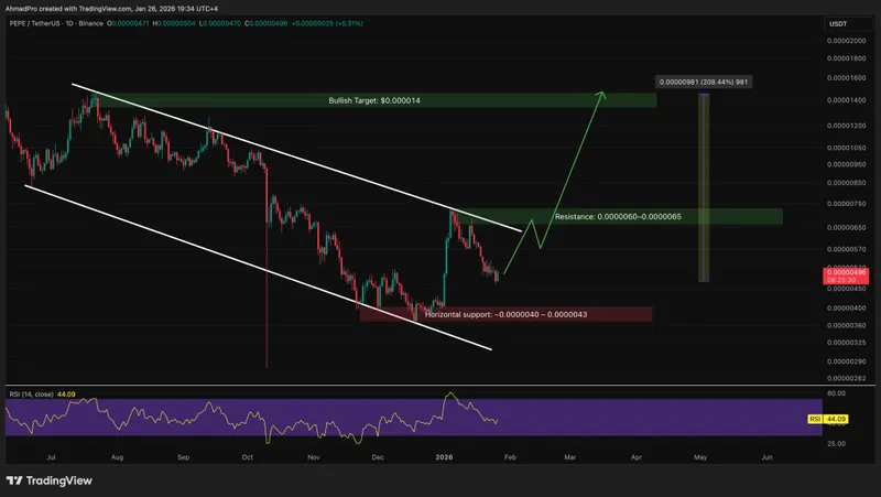 从技术角度看,PEPE在下降通道的上边界受到了尊重。如果突破0.000006美元的阻力位,市场将会出现看涨预期。
