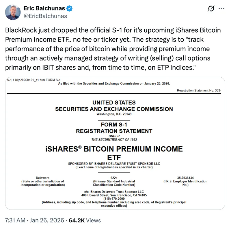 彭博高级ETF分析师Eric Balchunas在社交平台X上表示,BlackRock周一提交了iShares Bitcoin Premium Income ETF的S-1注册文件。该产品在跟踪比特币价格的同时,通过出售其现货比特币ETF(IBIT)的看涨期权来获取额外收益。