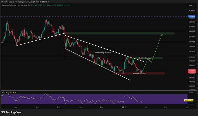 尽管如此,DOGE目前在0.12美元附近形成了坚实的支撑区,并已促成了一次不错的反弹。因此,买家至少在此处有所表现。接下来真正重要的水平是通道上缘,约在中0.14美元区域。该区域一直充当阻力,反弹在此处被抛售。