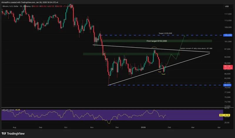 在此之前,市场主要处于观望状态。若支撑位被突破,可能会回落至中间的80,000美元区间,而若突破阻力,则将为多头提供实质性机会。