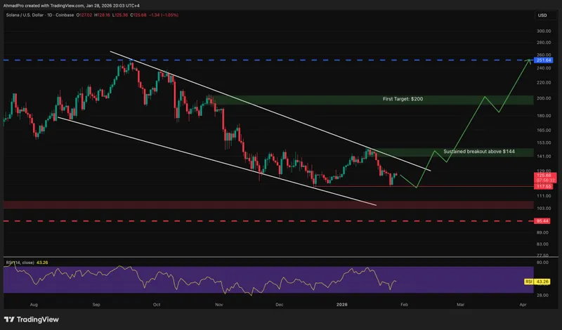 Solana价格仍在一个清晰的下降通道内交易,近期价格在118至120美元的支撑区间反弹。