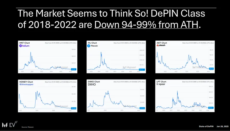 根据报告,2018-2022年启动的DePIN代币距历史高点已普遍下跌94%至99%。然而,领先项目如今已实现可验证的经常性收入,并以收入的10至25倍估值交易,相较于增长水平,Messari认为该估值处于被低估状态。