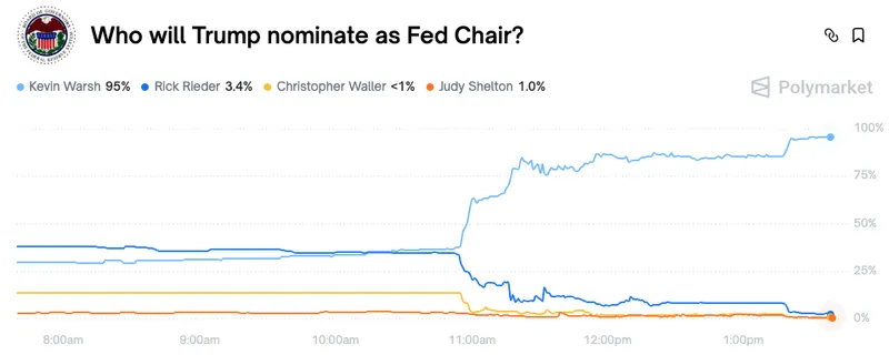 Warsh被提名为美联储主席的概率在预测市场Polymarket上激增至95%,而之前的热门人选贝莱德高管Rick Rieder的概率则降至3.4%。