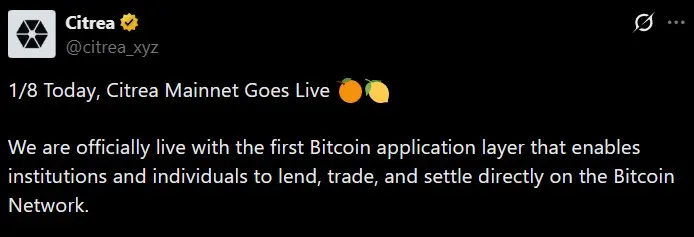Citrea推出比特币ZK-rollup主网,提供以BTC为担保的借贷、结构化产品及原生美元稳定币ctUSD,将比特币视为DeFi和支付的基础抵押资产。