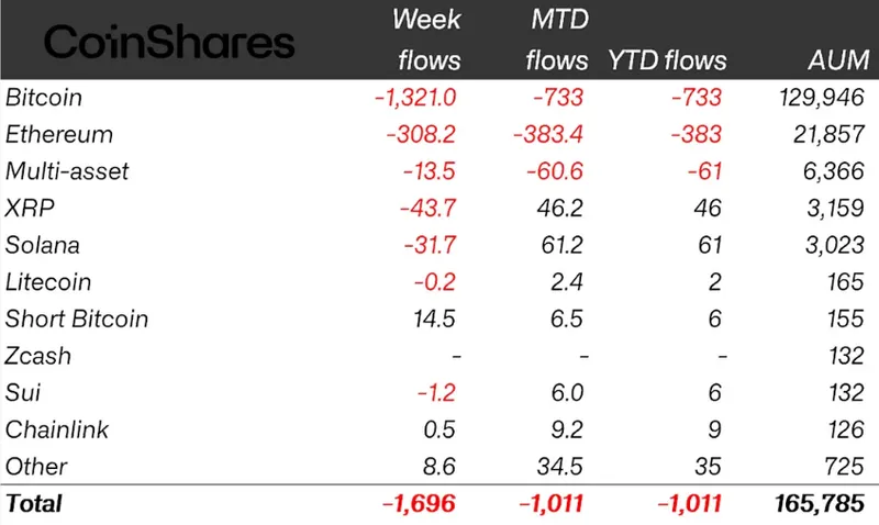 CoinShares披露,上周加密交易所交易产品(ETP)资金流出17亿美元,略低于前一周的17.3亿美元,两周累计流出达34.3亿美元。这使得今年以来的净流为负,累计撤资达10亿美元。