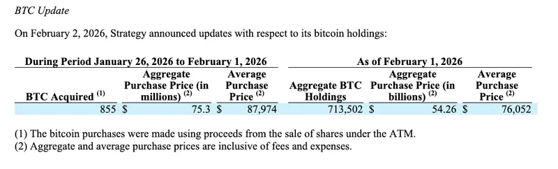 根据最新文件,Strategy上周以每枚约8.8万美元的价格购买了855枚比特币,因为BTC价格自2023年以来首次短暂跌破其平均成本。