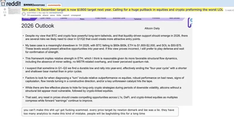 Cointelegraph去年12月曾报道,Lee预测ETH将在2026年第一季度回调至约1800美元,随后加密市场将企稳,并在年底前迎来复苏。