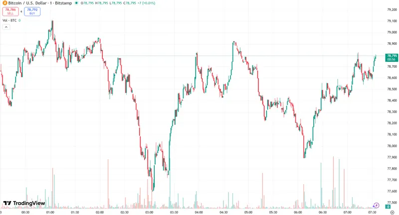 截至周二早晨,比特币交易价格为78,533美元。它以76,364美元的日内低点开盘,随后逐渐上涨至79,130美元的高点。尽管有所回落,但目前价格基本保持横盘状态。
