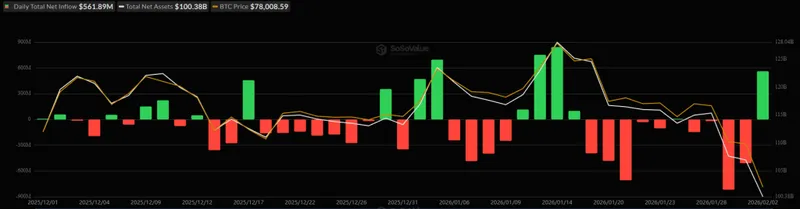 在经历了四天的资金流出后,美国比特币现货交易所交易基金(ETF)在周一的交易中录得561.89百万美元的正流入。因此,总净流入保持在550亿美元以上,达到了555.7亿美元。