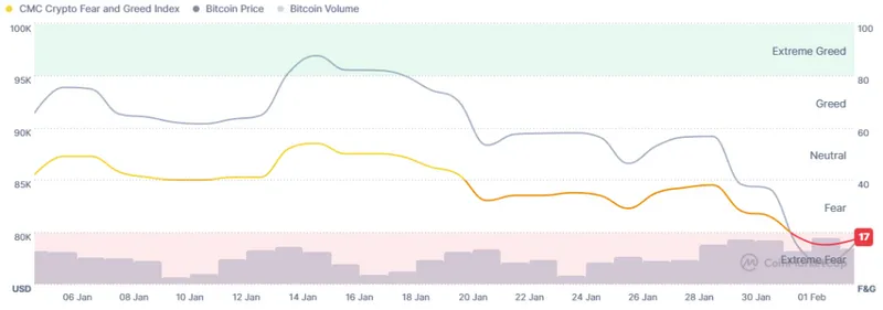 加密恐惧与贪婪指数今天为17,而周日/周一为18,周六为26。
