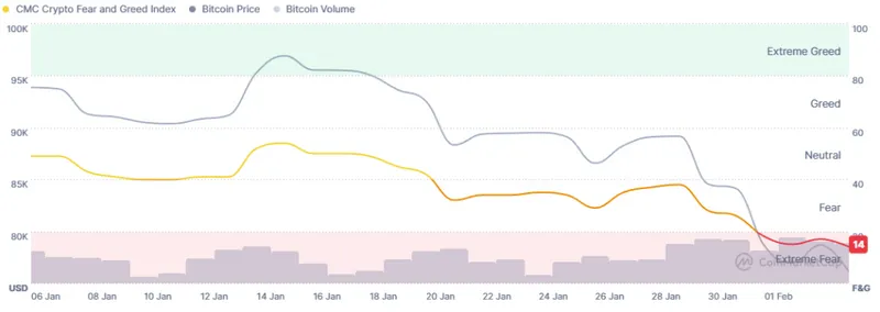 目前,加密恐惧与贪婪指数为14,相比昨日的17有所下降。这是自2025年11月底以来的最低水平。