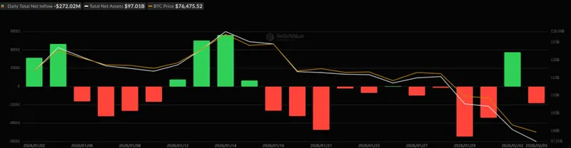 尽管本周初流入情况良好,但美国比特币现货交易所交易基金(ETF)在周二转为流出,流出金额为2.72亿美元,总净流入回落至553亿美元。