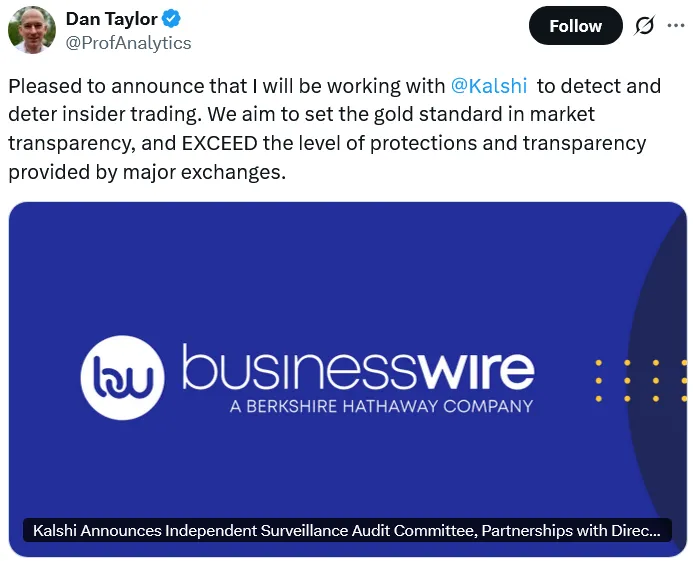Kalshi宣布,为了防范内幕交易和市场操纵,已在其预测市场平台上扩展监测措施,并成立独立顾问委员会,同时与合作伙伴加强监控,正值超级碗前夕。