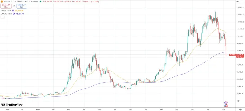 比特币已跌破200周指数移动均线,这一长期趋势指标在熊市极端阶段才会被下破。目前,比特币较历史最高价12.6万美元已下跌50%。