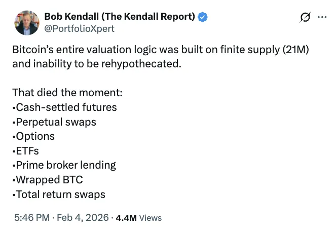 技术分析师Bob Kendall在社交媒体上表示:“同一枚比特币现在可以同时支持ETF份额、期货合约、永续掉期合约、期权头寸、券商贷款以及结构性票据。”