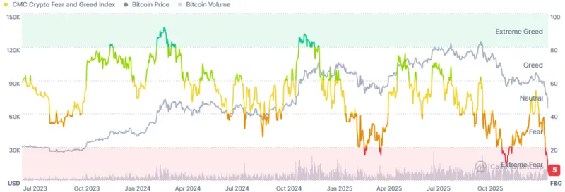 目前,加密恐惧与贪婪指数仅为5,较前一天的11大幅下跌,深陷极度恐惧区间。