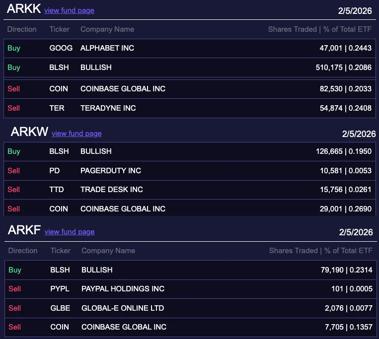 方舟投资公司(ARK)以1740万美元出售了Coinbase股票,同时以1780万美元买入了Bullish股份,这在加密货币市场动荡之际显示出其策略发生重大转变。