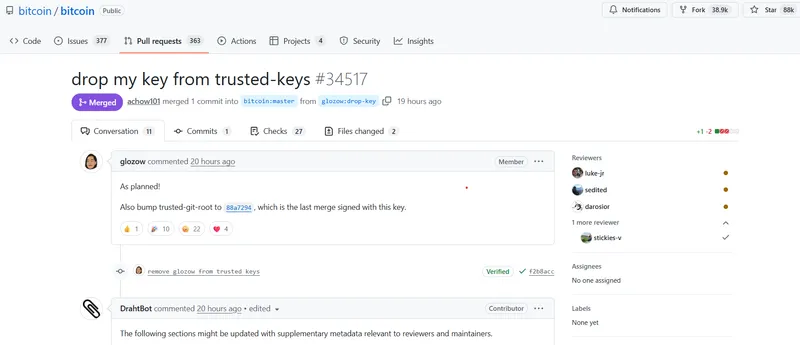 Gloria Zhao在比特币核心项目中担任维护者的六年时间里,她的贡献不可忽视。周四,Zhao向比特币GitHub仓库提交了最后一个拉取请求,删除了自己的密钥,结束了作为少数能够更新比特币软件的维护者之一的身份。