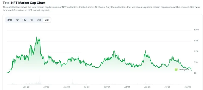 CryptoSlam数据显示,2025年流通中的NFT数量接近13亿,同比2024年增长25%。NFT总销售额同比下降37%至56亿美元,平均成交价已跌破100美元。