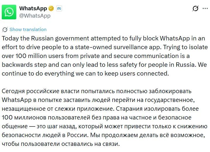 该公司在X平台上表示:“试图让超过1亿用户与安全的通信隔绝,是一种倒退,只会降低俄罗斯民众的安全性。我们将继续努力保障用户的连通。”