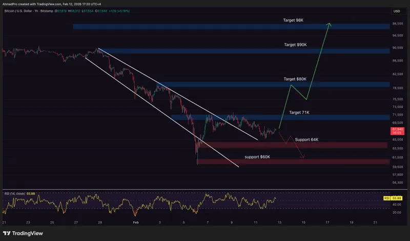 这个水平至关重要。如果能顺利突破并稳定在71,000美元之上,那么整个结构将显示出趋势转变的迹象,而不仅仅是反弹。