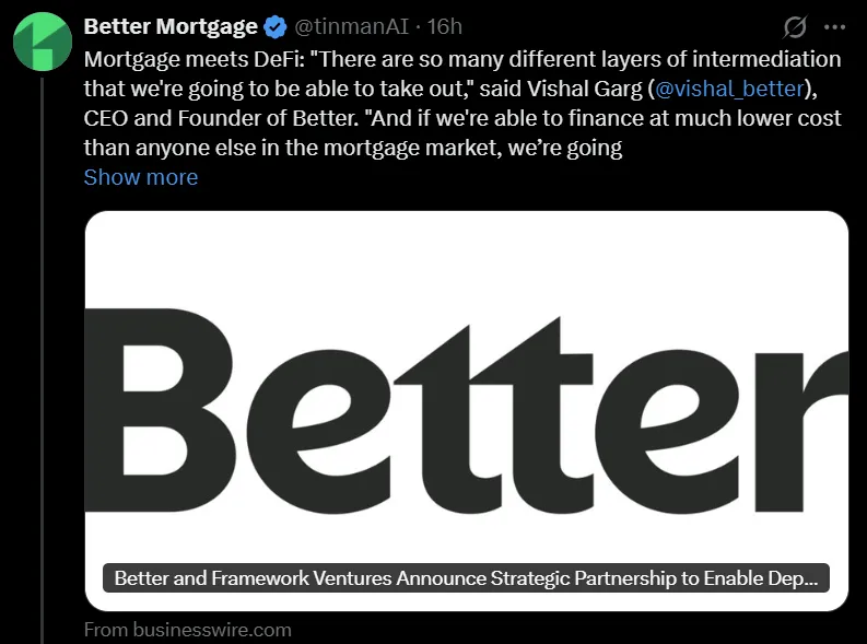 Better与Framework Ventures的合作为贷款融资引入了代币化机会,连接了抵押贷款与基于区块链的资本系统。