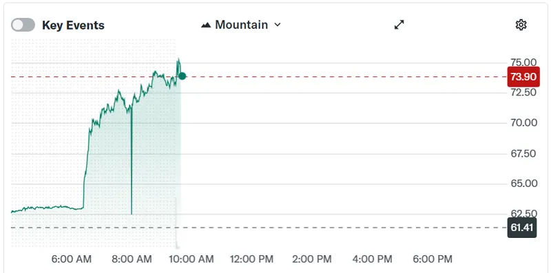 财报发布后,Circle股价在周三早盘一度上涨超过20%,接近74美元。