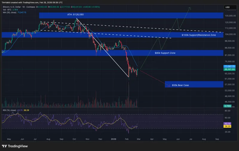 只要比特币不跌破60,000美元的支撑区间,其技术结构仍然保持建设性看涨。若跌至55,000美元,则可能开启进一步的新低。