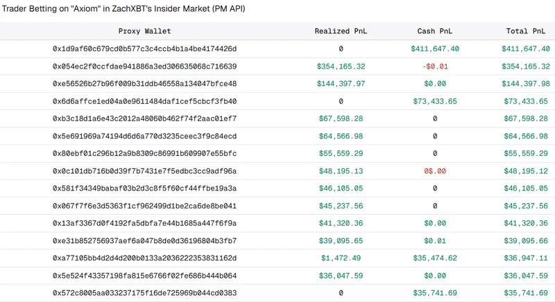 ZachXBT于周四发布了一份备受关注的调查报告,指控Axiom的员工Broox Bauer及其他人自2025年初以来参与内幕交易。