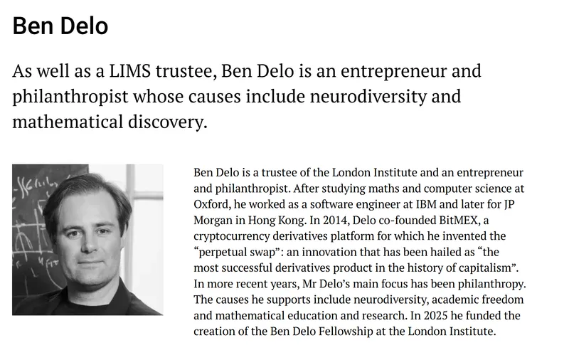 德洛还担任LIMS的受托人,曾资助神经多样性、学术自由以及数学教育与研究等多个公益项目。2025年,他资助创立了伦敦数学科学研究所的Ben Delo奖学金。