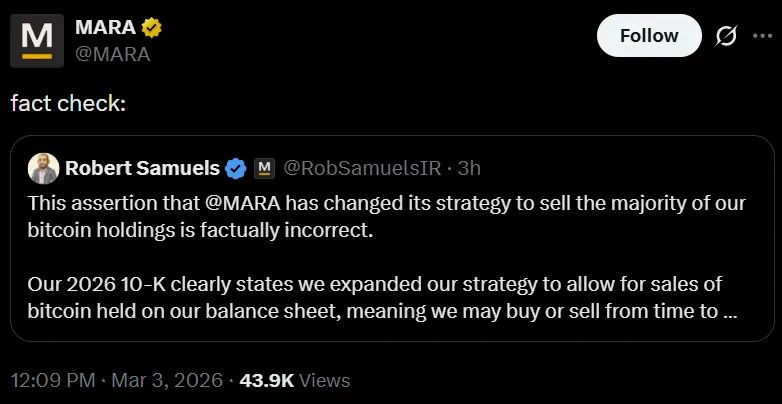 这一澄清由MARA投资者关系副总裁Robert Samuels在X平台上发布,他重申公司并未改变其核心比特币金库策略。
