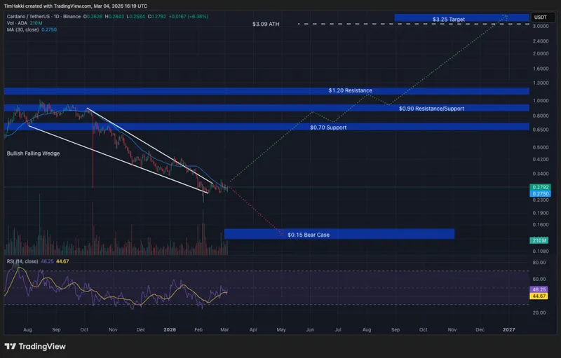 Claude的展望表明,ADA的价格可能从今天的约0.28美元上涨至接近3.25美元,这将超过2021年设定的3.09美元的历史高点。