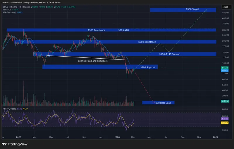 在Claude最乐观的情境下,Solana的价格可能从目前约91美元上涨至500美元,这将代表5.5倍的增长,并且高于2025年1月创下的293美元的历史最高点。