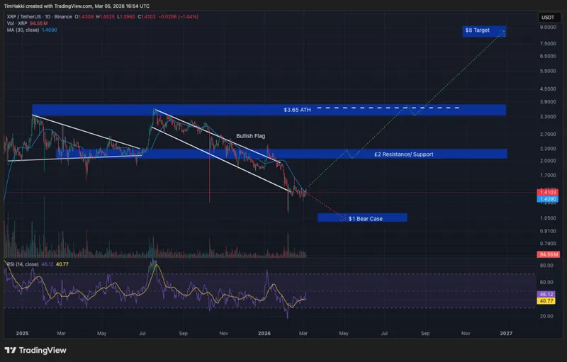 达到8美元的关键在于机构参与度的提升,尤其是在美国上市的XRP ETF推出后,以及Ripple不断扩展的国际合作关系和CLARITY法案在国会的通过。