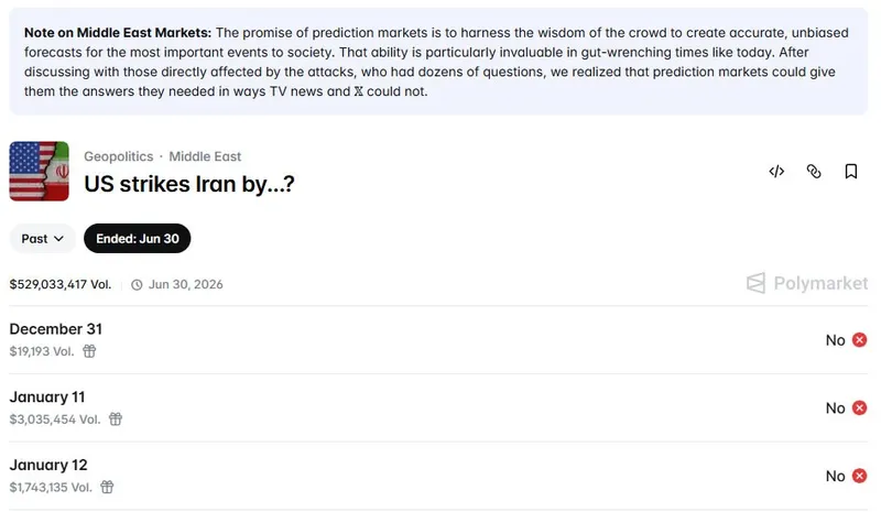 截至目前,围绕美国对伊朗打击的押注已在Polymarket平台上产生了5.29亿美元的交易量。上个月,一名Polymarket交易者通过对委内瑞拉总统Nicolás Maduro被俘事件的押注,及时获利约40万美元。