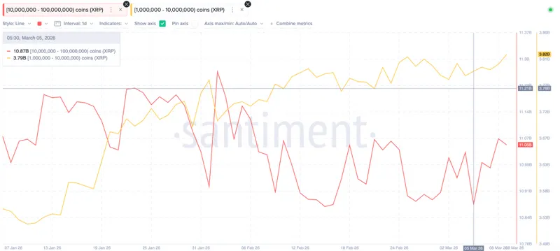 来自Santiment的数据表明,持有1百万到1亿XRP的鲸鱼钱包正在稳步增加其余额。