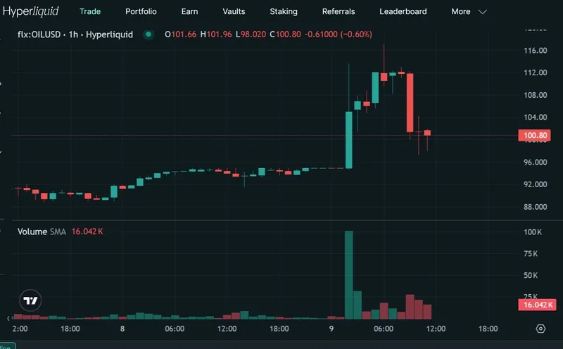 在Hyperliquid平台上,原油期货一度上涨近25%,夜间最高达到117美元,但在G7消息传出后,油价回落约14.5%,降至约100美元。这一变化表明,尽管供应仍受冲突威胁,交易员已迅速调整对释放储备的风险预期。