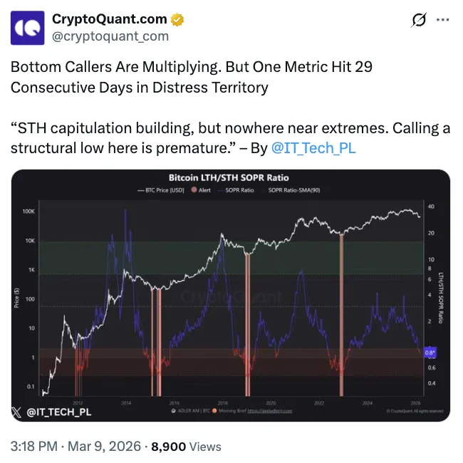 CryptoQuant的分析师IT指出,比特币长期持有者与短期持有者的盈利比指标已降至0.89,显示短线持有者正在亏损出售。