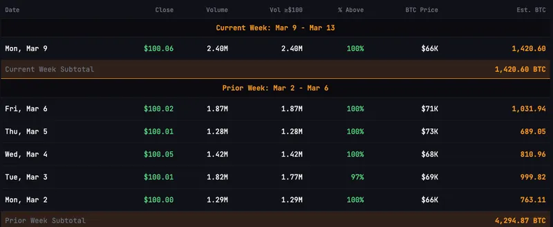 根据STRC.live的数据,Strategy通过其场内增发(ATM)计划出售了约240万股STRC,并在单日内购买了1420枚比特币(BTC),这一数字超越了之前1069枚的纪录。