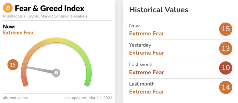 尽管社交媒体关于比特币的话题转向积极,但用于衡量整体加密情绪的Crypto Fear & Greed指数显示仍维持在15,处于“极度恐惧”区域。