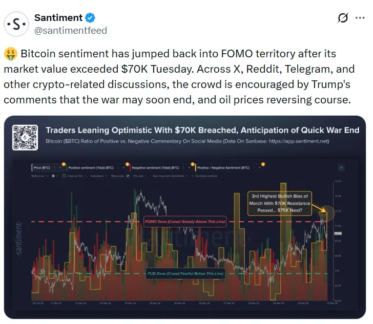 社交媒体对比特币的情绪在周二重新转向乐观,受到特朗普最新表态的推动,比特币价格回暖至70000美元以上。特朗普表示与伊朗的战争可能接近尾声。