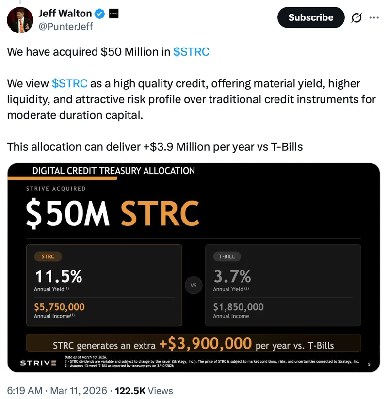 公司公告指出,此次投资占Strive金库储备的三分之一以上,显示出机构对与比特币相关的收益证券的兴趣不断上升。