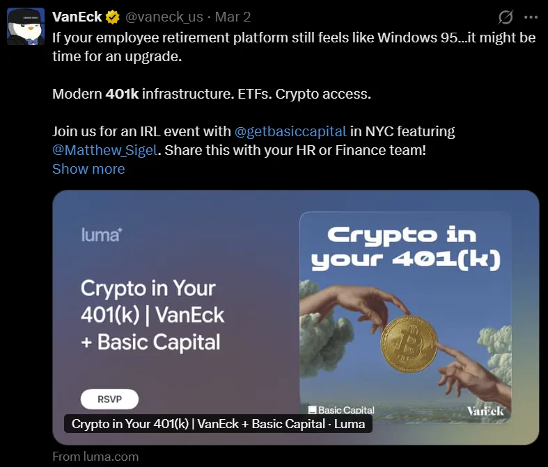VanEck已将其部分数字资产交易所交易产品(ETP)向美国401(k)持有人开放,显示出其将加密资产投资纳入传统养老账户的努力。