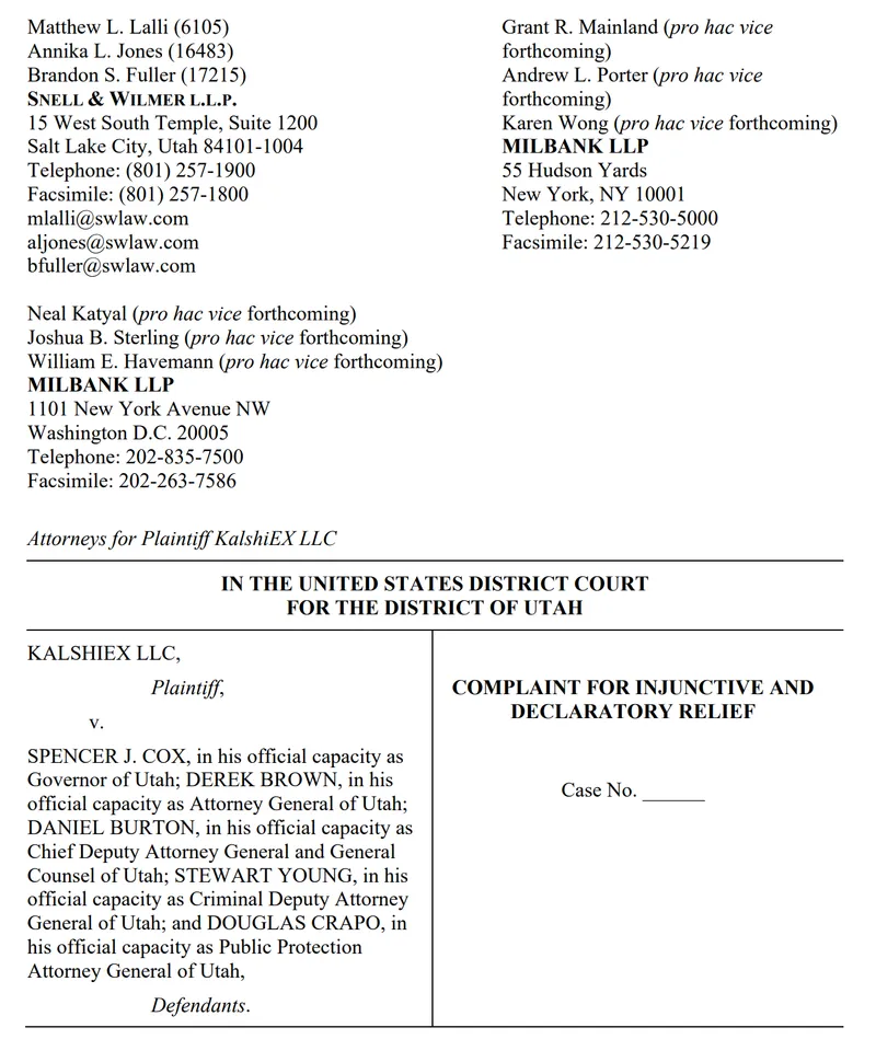 Kalshi在参议院通过法案后起诉犹他州