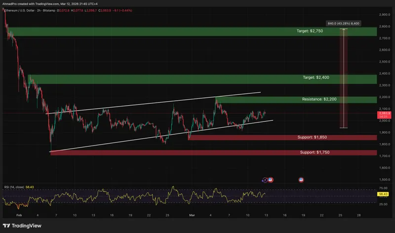 目前ETH在2小时图表上价格为$2,063,正处于自2月低点以来形成的上升楔形中。