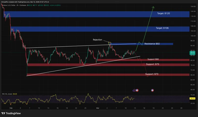 自2月份的低点以来,价格在上升楔形中形成了更高的低点。最近的走势显示价格在92美元处遭遇强烈阻力,这成为SOL与更高目标之间的关键障碍。