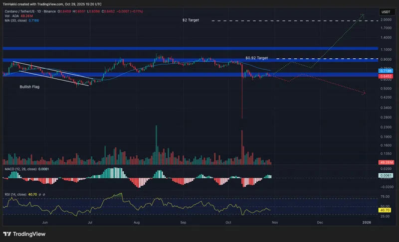 Claude AI预测,ADA在11月可能上涨至0.92美元,较当前约0.64美元的价格有44%的潜在收益。