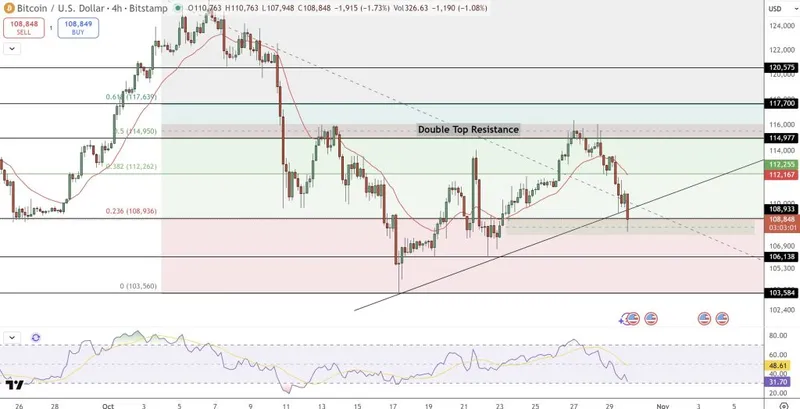 若日线收盘价高于$110,700,可能会触发向$112,200–$114,950的反弹,而若跌破$108,900,则可能会暴露出$106,100–$103,500的风险。交易者倾向于在$109,000以上建立多头头寸,目标为$114,950,超卖动能暗示可能在11月出现反弹。
